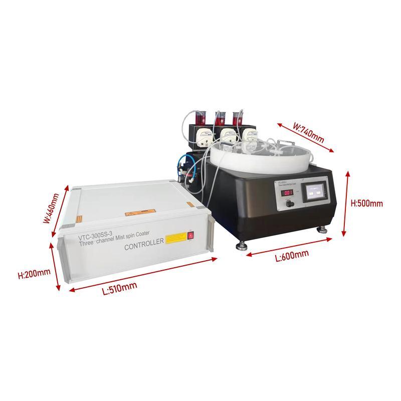VTC-300SS-3 is a Mist Spin-Spray Coater with compressive gas-driven spray heads for a multi-layer coating process on a large substrate up to 12". These three nozzles are adjustable up to 0.2MPa gas pressure.